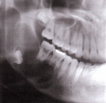 Рентгенологически — прозрачная тень с четкими границами, на фоне которой можно видеть включения зубных конгломератов; местами отмечается разрушение кортикальной пластинки.