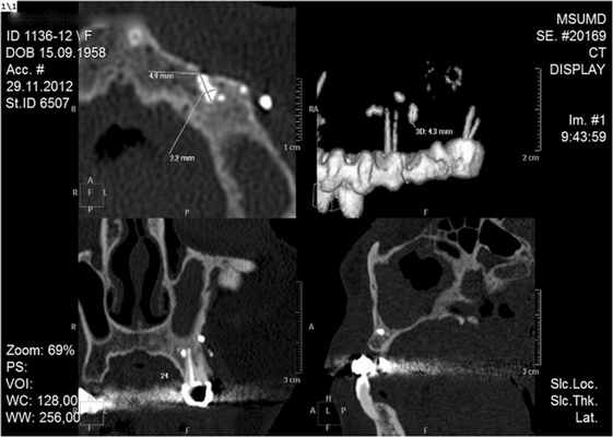 При анализе МСКТ-исследования на уровне верхушки щечного корня зуба 25 в мягких тканях, прилегая к вестибулярной кортикальной пластинке челюсти, было обнаружено скопление пломбировочного материала диаметром около 2,5 мм и аналогичное скопление диаметром