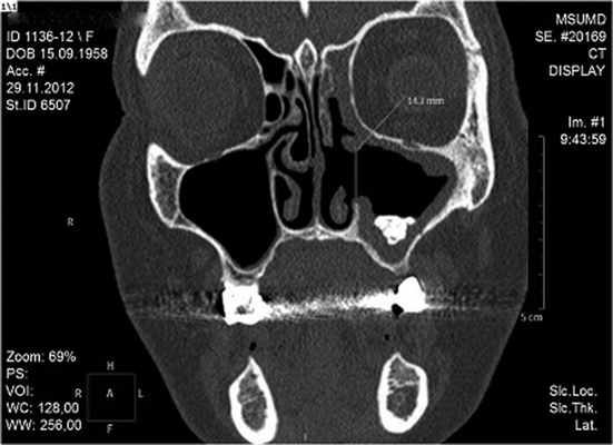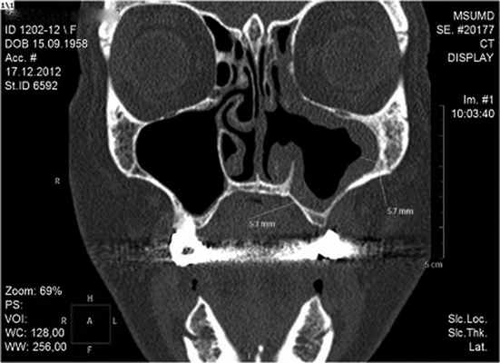 Для контроля состояния верхнечелюстного синуса и полноты удаления пломбировочного материала из полости пазухи в послеоперационном периоде проводили МСКТ-исследование.