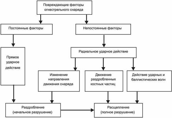 Постоянным фактором является прямое ударное действие снаряда [1—4], вызывающее локальное разрушение костной ткани, в развитии которого можно выделить несколько сменяющих друг друга этапов: столкновение снаряда с костью, вклинение и выход снаряда [1].