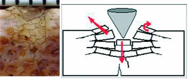Вклинение снаряда в кость является продолжением его поступательного движения. Давление вклинивающегося снаряда вызывает расщепление ткани по наметившимся трещинам в результате отрыва со сдвигом и без сдвига и перемещение костных осколков, т.е. вызывает полное локальное разрушение костной ткани (рис. 3, на цв. вклейке) [8, 9]. Рисунок 3. Перемещение костных осколков вклинивающимся снарядом.