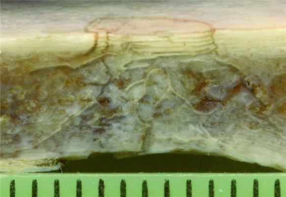 При высоком УУКЭ наблюдается одномоментное расщепление костной ткани преимущественно по кольцевидным и осевым трещинам. Морфологическими признаками такого перелома являются (рис. 4, а, на цв. вклейке): Рисунок 4. Морфология огнестрельного перелома при ранении огнестрельным снарядом с высоким (а), средним (б) и низким (в) УУКЭ снаряда.