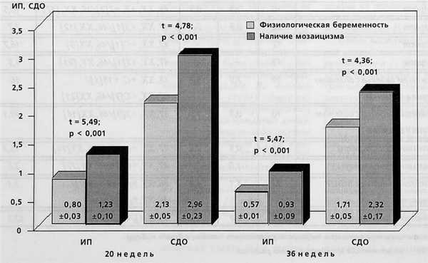 При оценке КСК в артерии пуповины на протяжении второй половины беременности, средние значения показателей сосудистой резистентности (ИП и СДО) в исследуемой группе не имели достоверных различий с таковыми-среди женщин с физиологически протекавшей беременностью [1], тогда как в маточных артериях данные показатели были достоверно выше среди беременных с плацентарным мозаицизмом при сроках беременности 20 и 36 недель (рис. 1).