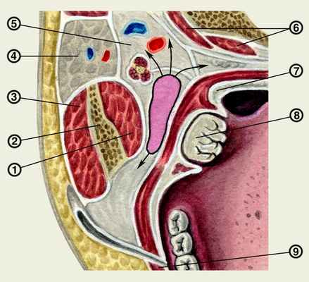 Схематическое изображение распространения инфекции при окологлоточном абсцессе (горизонтальный распил на уровне нижней трети головы): 1 — медиальная крыловидная мышца; 2 — ветвь нижней челюсти; 3 — жевательная мышца; 4 — околоушная железа; 5 — клетчатка окологлоточного пространства; 6 — длинные мышцы головы и шеи; 7 — околоминдаликовая клетчатка; 8 — небная миндалина; 9 — щечная мышца. Пути распространения инфекции указаны стрелками.