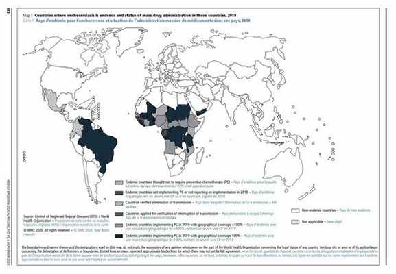 Онхоцеркоз распространен, главным образом, в тропических районах. Более 99% инфицированных людей проживают в 31 африканской стране к югу от Сахары: