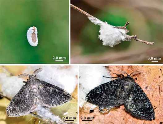 Вверху: личинка E. nawai на ниточке перед окукливанием (слева) и уже готовая куколка в коконе (справа). Внизу: взрослые самец (слева) и самка (справа) E. nawai.