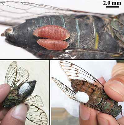 Гусеницы E. nawai на ранней стадии (вверху) и на поздней (внизу) на телах цикад.