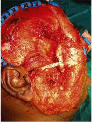 Фото 5: Визуализация костного дефекта после удаления опухоли, который затем был восстановлен посредством височной мышцы.