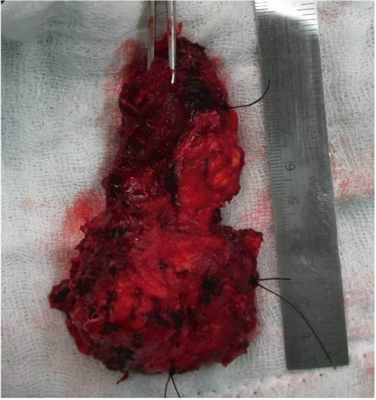 Клинически был поставлен диагноз рецидивирующей амелобластомы мультикистозного типа с поражением костного аугментата. Разрез в области опухоли проводили на расстоянии 1 мм от края непораженных патологией мягких тканей через уже имеющийся от предварительной операции контур шрама (фото 2-3). Образец, забранный для гистологии, позволил поставить диагноз фолликулярной амелобластомы с акантоматозными изменениями и свободным краями. Через 1 год после операции признаков рецидива не отмечалось. Таким образом, планировалось провести аллопластическую реконструкцию нижней челюсти с правой стороны, учитывая доброкачественную природу опухоли.