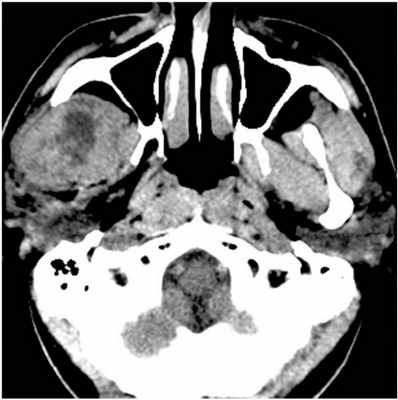 Фото 4: КТ-срез, сделанный до проведения операции: визуализация рецидивирующей амелобластомы в подвисочной ямке.