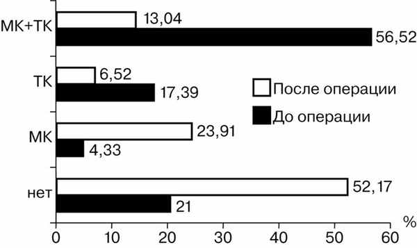 Рис. 2. Частота клапанной регургитации до и после хирургического лечения.