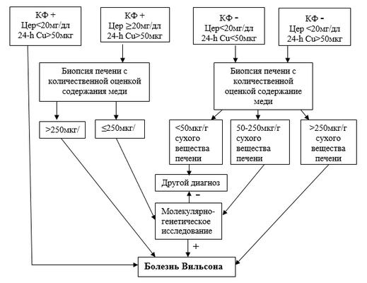 Рисунок 1- Алгоритм диагностики болезни Вильсона [3]. КФ – кольца Кайзера-Флейшера; Цер – церулоплазмин; 24-h Cu – суточная экскреция меди с мочой.