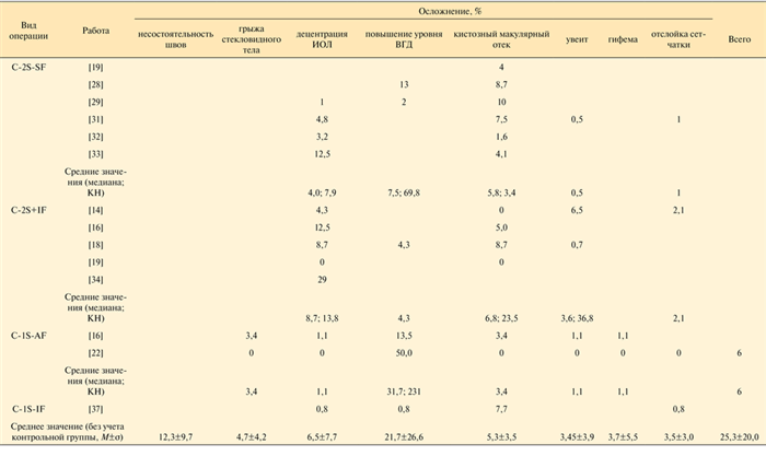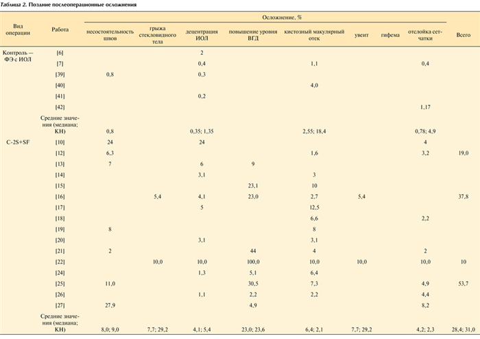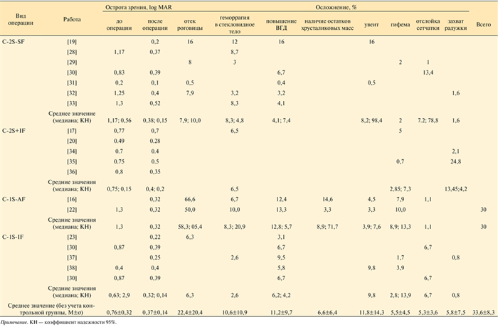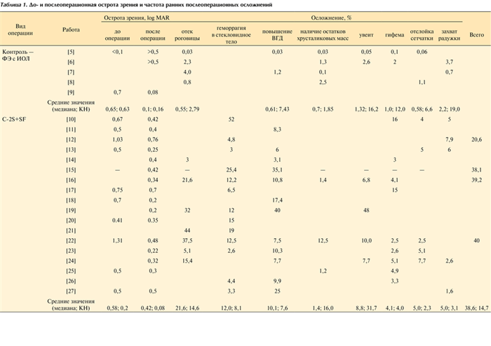 Для удобства анализа данных результаты отобранных работ сведены в единую таблицу с разделением ранних и отдаленных послеоперационных результатов. Непосредственные результаты хирургии осложненной катаракты и частота ее ранних послеоперационных осложнений представлены в табл. 1, а отдаленные (более 6 мес) исходы оперативного лечения — в табл. 2.