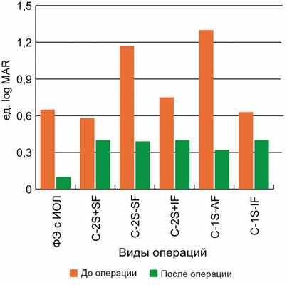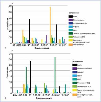 На гистограмме обращает на себя внимание относительно высокий уровень послеоперационной патологии ВГД, характерный для операций типа C-1S-AF, C-2S+SF и C-2S-SF. Для последних был также отмечен относительно высокий суммарный уровень осложнений. Довольно заметная частота возникновения кистозного макулярного отека была сравнимой во всех группах операций.