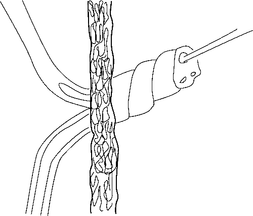 1. Найти вену, растянуть ее пинцетом (вена не спадается и бужирования не требует). Рис. 10.