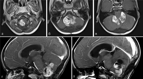 Пациентка Д., 4 года. Госпитализирована в институт 15.09.14. Диагноз: рецидив анапластической эпендимомы ствола и IV желудочка. Окклюзионная гидроцефалия. Состояние после удаления опухоли 20.06.12. Состояние после ЛТ и ПХТ (рис. 3). Рис. 3. Наблюдение 3: пациентка Д. Дооперационное МРТ-исследование, режим T1 с контрастом. а, б, в — аксиальная проекция; г, д — сагиттальная проекция. Пояснения в тексте.