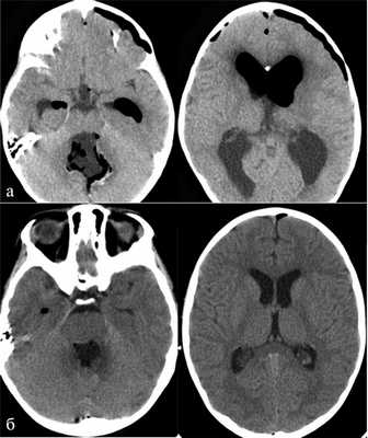 Пациентка Б., 4 года. Госпитализирована 12.05.15. Диагноз: анапластическая эпендимома IV желудочка. Состояние после удаления опухоли 18.07.12. Вентрикулоперитонеальное шунтирование 06.08.13. Состояние после ПХТ и Л.Т. Рецидив опухоли (рис. 2, а). Рис. 2. Наблюдение 2: пациентка Б. а — МРТ до операции (режим T1 с контрастом); б — МРТ через 1 мес после операции (режим T1 с контрастом). Пояснения в тексте.