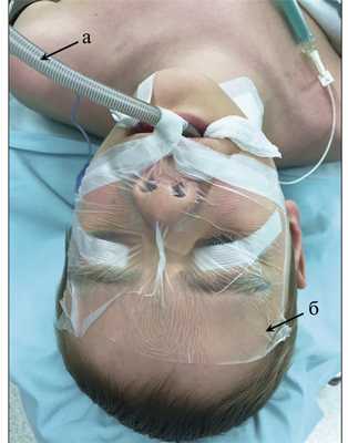 С хирургической точки зрения, пациент не требует какой-либо особой подготовки. Из анестезиологических особенностей важно то, что при установке венозных катетеров для инфузии различных жидкостей необходимо учитывать, что верхняя часть тела пациента будет абсолютно недоступной для анестезиолога после драпировки операционного поля и расположения вокруг пациента хирургической бригады. Оротрахеальная интубация осуществляется армированной трубкой в связи с вероятностью перегиба обычной трубки, особенно малого диаметра. Установка желудочного зонда желательна во всех случаях в связи с высоким риском регургитации (мы используем орогастральное зондирование. По окончании операции зонд удаляется в операционной). Под веки закладывается защитный глазной гель и вся область лица тщательно заклеивается стерильной прозрачной пленкой (рис. 2). Рис. 2. Интубация и подготовка лица пациента для предотвращения возможного затекания антисептика в глаза при обработке операционного поля. а — использование армированной трубки позволяет избежать проблем с ее перегибом; б — область глаз широко заклеивается «инцизионной» изолирующей пленкой для предотвращения возможного затекания антисептика. В самом начале использования положения «лежа на животе» в хирургии ЗЧЯ у нас было 2 случая химического кератита из-за затекания средства для обработки операционного поля в заклеенные по «общепринятой методике» глаза. Объяснение оказалось очень простым: в положении «лежа на животе» область латерального угла глаза является одной из самых нижних точек лица, куда стекает дезинфицирующее средство при обработке операционного поля. Использование мочевого катетера желательно даже при планировании очень коротких операций, так как в случае необходимости поставить его во время операции будет проблематично.