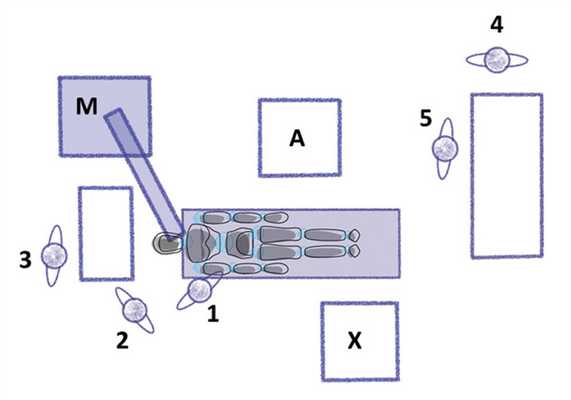 Мы адаптировали имеющееся у нас расположение оборудования, учитывая, что такие приборы, как наркозный аппарат, консоли с приборами, микроскоп, фактически стационарны и могут быть перемещены только в небольших пределах (рис. 6). Рис. 6. Схема расположения участников операции. 1 — хирург; 2 — ассистент; 3 — операционнная сестра; 4 — анестезиолог; 5 — анестезистка; А — анестезиологическая консоль с наркозным аппаратом; М — микроскоп; Х — хирургическая консоль со всем оборудованием. Такой подход к решению проблемы «привыкания» всех участников операции показал высокую эффективность. Фактически все они, кроме хирурга, продолжали работать в привычных условиях. Кроме того, предложенная расстановка позволяет при необходимости легко и быстро поменять сторону работы хирурга.