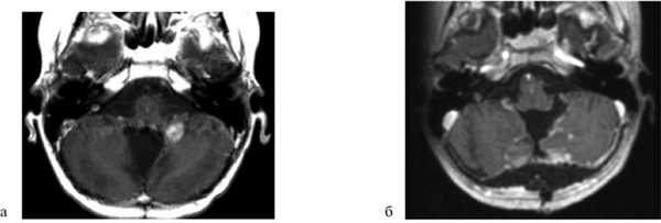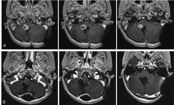 После операции несколько часов наблюдалась в отделении реанимации. В неврологическом статусе отмечен легкий парез VI нерва справа, сохранялась мозжечковая симптоматика. На 6-е сутки девочка выписана из стационара. На МРТ через месяц признаков опухоли нет (см. рис. 2, б).