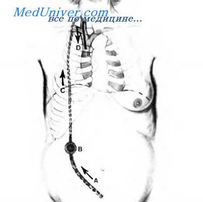 На этом полусхематическом рисунке показано функционирование шунта LeVeen. Стрелки отражают направление, в котором асцитическая жидкость течет из брюшной полости в верхнюю полую вену.
