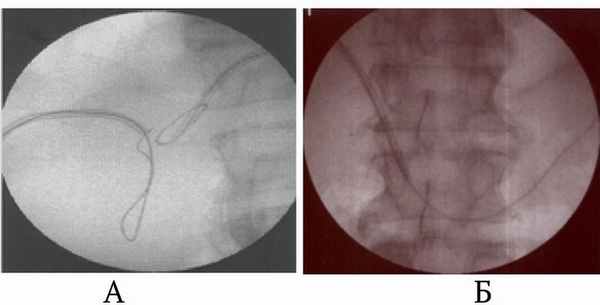 Рис. 1. Профилактика дислокации холангиостомических дренажей. Наличие металлических проводников в просвете дренажей, желчных протоков (А) и двенадцатиперстной кишки (Б)