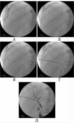 Рис. 2. Восстановление дислоцированного дренажа ЧЧХС по проводнику, оставленному в желчных протоках. А – дренаж в поддиафрагмальном пространстве, проводник остался в просвете желчных протоков. Б – удален дренаж, В – проводник распрямлен, Г – по проводнику в желчные протоки введена игла УДПО, Д – дренаж введен в желчные протоки Учитывая, что большинство осложнений ЧЧХС возникает в результате дислокации дренажа [5], основное внимание уделяли надежной фиксации дренажа в желчных протоках. С этой целью в просвете дренажа и желчных протоков оставляли металлический проводник. Проводник вводили в двенадцатиперстную кишку или сворачивали в протоках, препятствуя его смещению (рис. 1). При этом кончик дренажа не упирался в стенку протока, что исключало «анкерный» механизм дислокации. Кроме того, при развитии неполной дислокации дренажа проводник еще оставался в протоке и по нему можно было вновь ввести выпавший катетер (рис. 2). В результате предпринятых мер профилактики в раннем периоде после ЧЧХС ни у одного больного не было полных дислокаций дренажа и желчеистечения в полость брюшины. Длительность госпитализации после ЧЧХС или ХС в стационарах по месту жительства составила 10.05±1,65 суток. Летальных исходов после успешно выполненного желчеотводящего вмешательства на этом этапе лечения не было. При длительных сроках наружного желчеотведения по холангиостоме у 28 (5,67%) больных произошла дислокация дренажа. Во всех наблюдениях дренаж удалось восстановить по свищевому ходу, оперативных вмешательств не потребовалось. Для восстановления выпавшего дренажа применяли специальные металлические канюли, имеющие оливовидное утолщение на рабочем конце. Катетеризировать желчный пузырь при холецистостомии удалось у всех 55 больных (100%). Технических сложностей и осложнений при чрескожной холецистостомии не отметили. Для холецистостомии использовали дренажи, фиксирующиеся с помощью нити, что у всех больных позволило избежать дислокации. Холецистостомические дренажи всем больным заменяли каждые 3 месяца в плановом порядке. Попытка реканализации желчевыводящих протоков была предпринята у 274 пациентов, что составило 51,6% от общего числа больных с холангиостомами. У 114 пациентов (41,61%) реканализация удалась с первой попытки. У 62 больных (22,63%) потребовалась повторная попытка реканализации. У 98 пациентов (35,77%) преодолеть зону окклюзии желчных протоков не удалось. У 1 больного во время реканализации отметили перфорацию общего желчного протока, которая клинически ничем не проявилась. Других осложнений, связанных с реканализацией желчных протоков, не отметили. Эндопротезирование желчевыводящих протоков выполнили 212 раз у 163 (30,7%) больных. В том числе у 8 человек эндопротезы установили в протоки обеих долей печени. В среднем эндопротезирование выпонияли через 7,6±1,3 суток после успешной реканализации желчных протоков. У 1 (0,6%) пациентки во время эндопротезирования отметили технические сложности, которые привели к неудачной попытке. В отдаленном периоде не было дислокации эндопротезов и окклюзии их за счет прорастания опухолью. У 1 больного (0,6%) после эндопротезирования развились множественные абсцессы печени. Выполнили пункционное лечение, исход благоприятный. У 1 больного эндопротез мигрировал в паренхиму печени. У 108 больных спустя различные сро