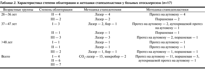 Хирургическое лечение у всех больных выполнялось под местной анестезией при отсутствии активности отосклеротического процесса. Оценка локализации очагов отосклероза проводилась после удаления арки стремени. Облитерирующая форма отосклероза I степени выявлена в 4 случаях, II степени — в 6 и III степени — в 7 по классификации J. Nadol и M. Mckenna [20], что соответствовало данным, полученным при КТ височных костей. В случаях сужения ниши окна преддверия его расширение осуществлялось с помощью микроложки или алмазного микробора. Стапедотомия выполнялась в наиболее тонком месте подножной пластинки стремени и, как правило, в задних ее двух третях. Техническое обеспечение значительно упрощало этап стапедотомии независимо от степени облитерации (табл. 2). Таблица 2. Характеристика степени облитерации и методики стапедопластики у больных отосклерозом (n=17) Для стапедотомии в 15 случаях применялась бесконтактная CO2-лазерная система (λ — 10,6 мкм) с наличием флешсканера и суперимпульсного режима (Acuspot 712, Lumenis, USA), а в остальных — микробор. Количество расфокусированных импульсов СО2-лазера при этой патологии колебалось от 1 до 15. При этом большее их количество отмечено при III (от 1 до 15 импульсов) и I (от 1 до 4) степенях облитерации. В 5 случаях была выполнена поршневая стапедопластика (диаметр стапедотомии 0,6—0,9 мм, протез стремени 4,25×0,5 мм), в 11 — установка протеза стремени (4,25×0,5 мм) на аутовену, закрывающую отверстие (0,7—1 мм) в основании стремени, и в 1 — подобная методика (диаметр стапедотомии >1 мм), но с использованием аутохрящевого протеза (3,5×1,0 мм). Преимущественное использование СО2-лазера при этой форме отосклероза обусловлено возможностью формирования отверстия в основании стремени заданного размера с помощью расфокусированного импульса и безопасностью его многократного применения. В большинстве случаев на выбор методики стапедопластики влияли особенность строения ниши окна преддверия, кровотечение из сосудов слизистой оболочки этой зоны и плотность очагов отосклероза.