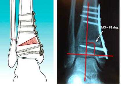 На стадиях 2, 3А, при относительно сохранном объёме движений и поражении внутренних отделов сустава показана вальгизирующая надлодыжечная остеотомия большеберцовой кости.
