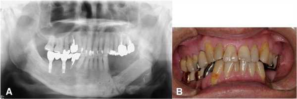 Через 4 года после радиотерапии пациент начал испытывать болевые ощущения в области имплантатов, установленных с левой стороны, в том же участке у него наблюдалось значительное воспаление и отечность десен. После постановки диагноза периимплантита ему было проведено консервативное лечение, состоящее из местной ирригации области поражения и периодического приема антибиотиков на протяжении 6 месяцев. Однако симптомы поражения только усиливались, и он был направлен в нашу больницу для проведения дальнейшего лечения патологии.
