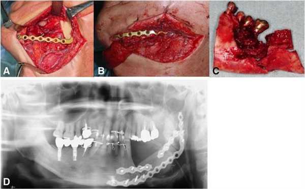На первом этапе лечения пациент прошел курс 30 сеансов гипербарической кислородной терапии, что позволило лишь незначительно улучшить имеющиеся симптомы поражения. Учитывая, что на рентгенологических снимках не было замечено никакого прогрессирования области деструкции, была проведения частичная резекция области нижней челюсти с последующим восстановлением дефектного участка посредством свободного микроваскулярного лоскута из малоберцовой кости. Фиксация трансплантата проводилась с использованием титановой пластины (фото 4).