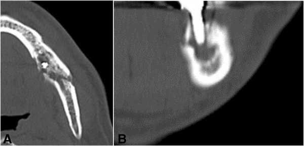 • Необходимо исключить рецидив плоскоклеточного рака как источник боли и разрушения кортикальной пластинки: