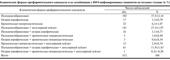 Комбинации клинических форм ОФК. Более половины пациентов (52,9±2,21%) имели различные комбинации клинических форм. При их анализе выявлено 6 двухкомпонентных и 2 трехкомпонентных сочетаний (см. таблицу). Клинические формы орофарингеального кандидоза и их комбинации у ВИЧ-инфицированных пациентов на поздних стадиях (в %)