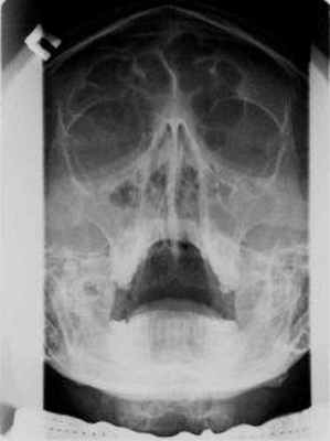 Чаще встречающаяся катаральная форма острого гайморита ведет к отеку слизистой оболочки и значительному увеличению ее толщины, что находит свое выражение в характерных рентгенологических симптомах. На типичной рентгенограмме в подбородочно-носовой проекции при наклонном положении головы больного обнаруживается незначительное понижение воздушности пазухи и характерное краевое затемнение, обычно одинаковой ширины на всем протяжении, с резкими контурами.