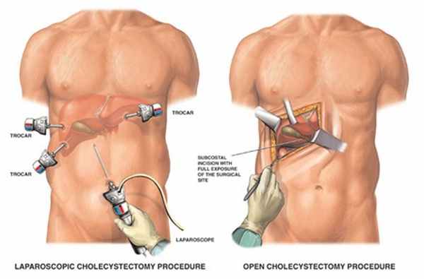 - Традиционная (открытая) холецистэктомия.(рис 1 справа)