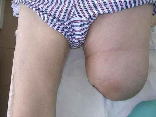 Подкожная жировая клетчатка значительно больше подвержена опасности образования отека. Ввиду того, что она расположена непосредственно под кожей, диагноз достаточно прост. Если при умеренном нажиме на кожу в течение нескольких секунд образуется вмятина (ямка), это свидетельствует об отеке, который можно прослеживать при соответственно более длительном давлении. Не сложнее и диагностика хронического отека. Здесь подкожную жировую клетчатку не удается вдавить пальцами, так как ткани затвердели. Кожа обретает коричневую окраску вплоть до темно-синей. Такое окрашивание обусловлено продуктами разложения крови, так называемым гемосидерином. Часто возникают даже надрывы кожи, обычно в области рубца. Оперативное удаление язвы и скоплений гемосидерина определенно приводит к рецидиву, если не устранить основную причину. Она связана практически всегда с гильзой протеза, которая в проксимальном отделе оказывает большее давление, чем в дистальном.