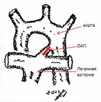 Анатомия. Чаще всего ОАП отходит на 5-10 мм ниже устья левой подключичной артерии и впадает в левую легочную артерию. При аномалиях развития аорты (правостроняя дуга аорты) может быть правостороннее отхождение ОАП, либо двухсторонний вариант. ОАП обычно имеет коническую форму суживаясь к легочному концу, но бывают и варианты извитого, широкого или тонкого сосуда.
