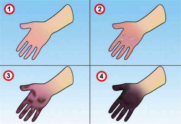 Отморожения классифицируют по глубине поражения тканей на 4 степени: