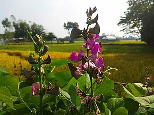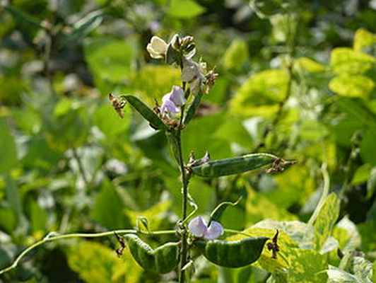 в) Ботаническое описание. Крупное прямостоячее или вьющееся растение семейства бобовых (мотыльковых) без усиков на листьях. Толстокожие многосемянные плоды (бобы) длиной до 35 см; крупные семена сплюснутой или сферической формы различной окраски — от зеленой до пурпурной или синей.