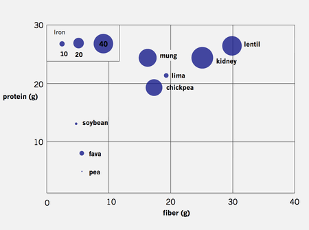 На этом рисунке показано количество граммов клетчатки и белка на 100-граммовую порцию каждого бобового. Размер круга пропорционален содержанию в нем железа. С этой точки зрения, чечевица и фасоль содержат больше всего питательных веществ, а соевые бобы и горох содержат меньше всего питательных веществ на порцию.