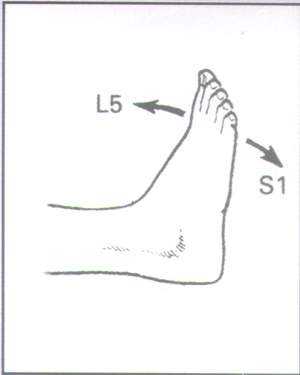 Слабость при разгибании большого пальца и стопы указывает на вовлечение корешка L5 (рис. 4). Для поражения корешка S1 характерен парез икроножной мышцы (больной не может ходить на носках).