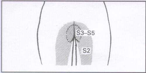 Обратите внимание на любую болезненность и онемение в промежности. Они могут указывать на иррадиацию из второго или третьего крестцового позвонка. Расспросите пациента о любых возникших изменениях функции кишечника и мочевого пузыря, которые могут быть связаны с крестцовым сплетением.