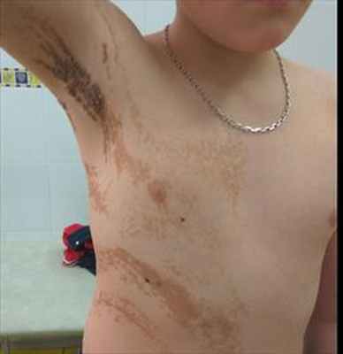 В стационаре ДКВО ГКБ №14 им. В.Г. Короленко мы наблюдали 13-летнего пациента, который, со слов матери, заболел в возрасте 6 мес. Появившееся вначале на боковой поверхности шеи розовое пятно постепенно стало коричневым, а к возрасту
