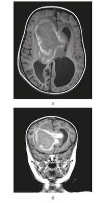 Рисунок 1. Магнитно-резонансные томограммы грудного ребенка 11 мес с гигантской внутрижелудочковой опухолью. а — Т1 с контрастным усилением, аксиальный срез, б — Т1 с контрастным усилением, фронтальный срез.