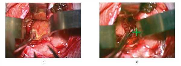 Рисунок 4. Гигантская опухоль бокового желудочка — вид операционной раны через микроскоп. a — внешний вид опухоли, б — этап удаления — видно отсутствие обильного кровотечения в ране.
