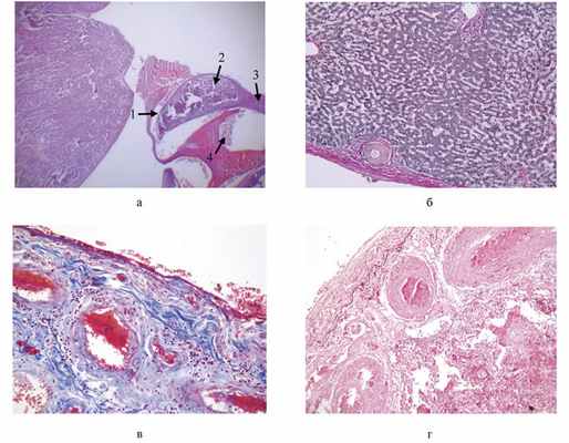 При гистологическом исследовании материала в головном мозге определяется выраженный периваскулярный и перицеллюлярный отек, в миокарде — выраженный интерстициальный отек с воспалительными инфильтратами, содержавшими лимфоциты, плазматические клетки, эозинофилы. Гипертрофированные мышечные волокна с множественными кистами и наличием в них личиночных форм паразита со сформировавшимися соединительнотканными капсулами. В области перикарда определяются прилегающие к нему фрагменты метацеркарии легочной двуустки со скоплениями эритроцитов (см. рисунок, Кистозно-пневмосклеротическая фаза генерализованного ларвального парагонимоза. а — погибшая метацеркария легочной двуустки у перикарда: 1 — кутикула личинки, 2 — тело личинки, 3 — хвост личинки, 4 — cкопление эритроцитов. ШИК-реакция, ×100; б — паразитарная киста в капсуле печени с выраженным фиброзом. Окраска по ван Гизону, ×200; в— соединительнотканные кисты легочной двуустки, располагающиеся под плеврой. Окраска по Маллори, ×400; г— соединительнотканные кисты легочной двуустки, располагающиеся под плеврой. Окраска орсеином, ×400. а). В печени (см. рисунок, б) непосредственно под капсулой и в паренхиме множественные паразитарные кисты с наличием погибших паразитов. В паренхиме правой почки паразитарные кисты, дистрофические изменения эпителия канальцев, очаговая лимфоидно-клеточная инфильтрация по периферии кист и в интерстиции. В ткани легкого (см. рисунок, в, г) множество паразитарных кист, часть из которых замещена фиброзной тканью. Межальвеолярные перегородки утолщены, с очаговой лимфоидно-плазмоцитарной инфильтрацией преимущественно вокруг кист. В селезенке умеренная гиперплазия белой пульпы, паразитарные кисты с наличием эритроцитов в центральной части. В желудке слизистая оболочка с диффузной воспалительной инфильтрацией и тенденцией к формированию эрозии, с участками фиброзирования и дискомплексации желез, обнаружены паразитарные кисты на серозной оболочке и в ней. В жировой ткани малого сальника множественные паразитарные кисты.