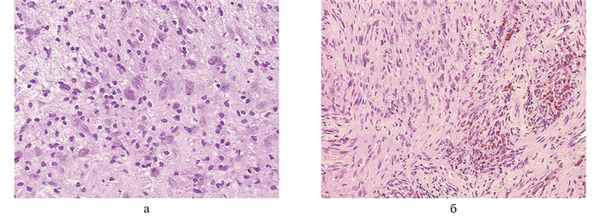 При микроскопическом исследовании выявлена типичная морфологическая картина невриномы с преобладанием веретеноклеточных компактных очагов Antoni A участков рыхло расположенных клеток с фокусами липоидоза (Antoni B), явлениями ангиоматоза с гиалинозом стенок сосудов и следами старых кровоизлияний в виде отложений гемосидерина. Кроме того, выявлялись единичные фокусы выраженного ядерного полиморфизма. Фигур митотического деления, очагов некротических изменений не обнаружено (рис. 3). Рис. 3. Клинический случай 1. Гистологический препарат, окраска гематоксилином и эозином (фото). Морфологическая картина невриномы. а — очаг ядерного полиморфизма среди рыхло расположенных шванновских клеток — Antoni B (увеличение ×400); б — глыбчатые отложения гемосидерина вокруг сосудов в зоне компактно расположенных вытянутых клеток — Antoni, А (увеличение ×200).