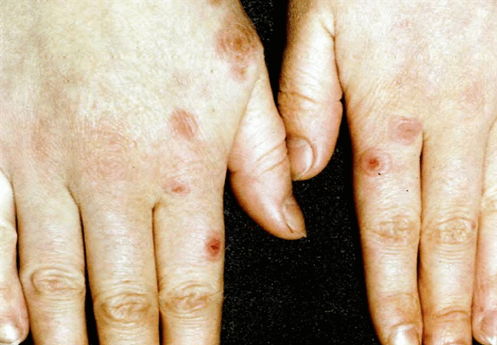 Гаммеля – самая распространенная эритема, характеризуется внезапно возникающими полосами, шелушением, зудом. Зуд может сопровождаться мацерацией, не поддается купированию. Чаще всего связь с раком легких, молочных желез, возникать может в разные сроки. Дифференциальная диагностика с розовым лишаем.