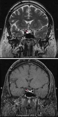 Вопрос об исключении опухоли гипофиза ставят при наличии головных болей, характерных расстройств зрения и эндокринопатии. Проводят нейровизуализационные исследования с толщиной среза 1 мм. МРТ более чувствительна, чем КТ, особенно для выявления микроаденом.