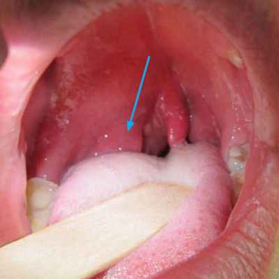 - Передний (передне-верхний) абсцесс. Возникает в большинстве случаев. Воспаление локализуется между передней небной дужкой и верхней областью миндалины, откуда инфекция попадает в околоминдалинную клетчатку.